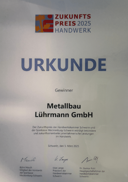 Die Handwerkskammer Schwerin und die Sparkasse Mecklenburg-Schwerin zeichneten Metallbau Lührmann mit dem Zukunftspreis Handwerk 2025 aus.